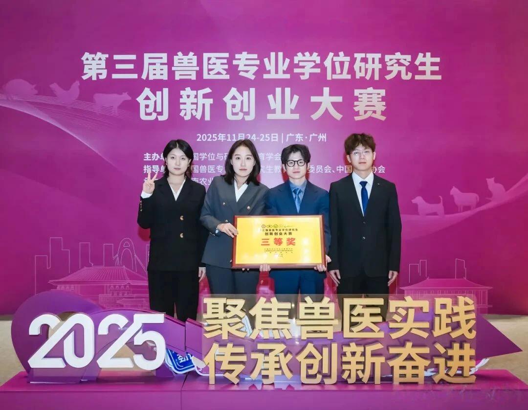 近日,第三届全国兽医专业学位研究生创新创业大赛决赛在广州圆满落幕。我校动物科学技术学院/动物医学院参赛团队凭借过硬的专业素养、突出的创新能力和扎实的实践成果,在全国众多优秀队伍中脱颖而出,成功斩获全国三等奖,为学校赢得荣誉。