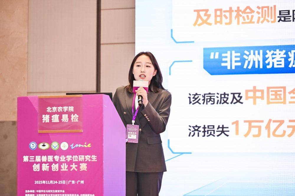 我校兽医专业硕士研究生张宁怡、毛锦明、栾晓雪、李林组成的“猪瘟易检”团队,在董虹教授指导下,聚焦养猪行业关键难题,成功研发非洲猪瘟快速检测试剂盒,项目创新性与应用前景突出,得到了大赛评委及与会专家的高度认可与一致好评。