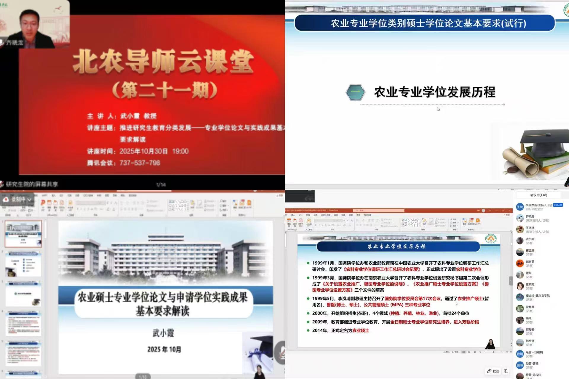 党的二十届四中全会将“科技自立自强”“教育、科技、人才一体推进”作为国家战略的核心支撑,强调通过高质量教育培养服务国家需求的创新人才。为深入落实全会精神,10月30日北农导师云课堂第二十一期顺利开展,东北农业大学武小霞教授带来“推进研究生教育分类发展——专业学位论文与实践成果基本要求解读”专题讲座,帮助导师准确把握专业学位研究生培养的新要求、新标准,提升指导能力。来自校内外的145名研究生导师与研究生教育管理人员参加了此次培训。