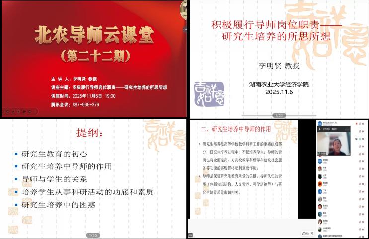 为深入贯彻落实立德树人根本任务,提升研究生导师队伍育人能力,11月6日,研究生院举办“北农导师云课堂(第二十二期)”,湖南农业大学李明贤教授进行了题为“积极履行导师岗位职责——研究生培养的所思所想”的导师专题培训,围绕“研究生培养的初心与使命”“导师角色定位”“学生核心素养培育”等核心议题展开深入探讨。来自校内外的195名研究生导师与研究生教育管理人员参加了此次培训。